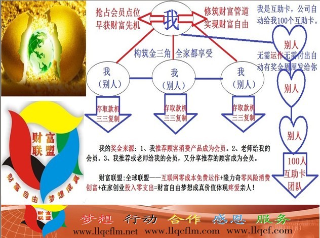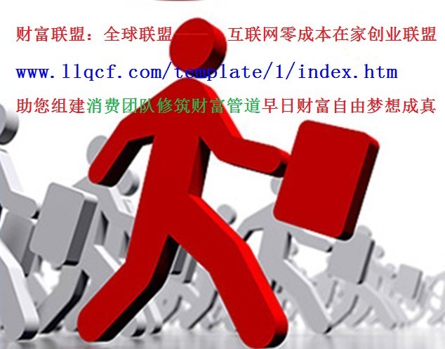 財富聯(lián)盟:全球聯(lián)盟——互聯(lián)網(wǎng)零成本零風險在家創(chuàng)業(yè)聯(lián)盟(五大文化:夢想、行動、合作、感恩、服務)宗旨:尋找和幫助不愿意東奔西跑勞苦奔波受盡風吹雨打嚴寒酷署煎熬,而希望在家創(chuàng)業(yè)以小博大一根網(wǎng)線一臺電腦一杯咖啡一件睡衣,就可以輕松借助互聯(lián)網(wǎng)零成本在家創(chuàng)業(yè),服務全球消費者的順應時代趨勢大成功的有志之士、尋找本身已有工作但想兼職在互聯(lián)網(wǎng)零成本在家創(chuàng)業(yè)修筑財富管道的有志之士、尋找不方便外出上班辛苦打工必須在家照顧親人孩子的家庭主婦和模范煮夫借助互聯(lián)網(wǎng)零成本在家創(chuàng)業(yè)以及年老體弱不方便外出的退休養(yǎng)老之人……