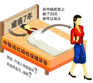 隨后,丁女士又給記者講起了產(chǎn)品的功效:“有一個車禍癱瘓七年的,就在這個床墊上躺了23天,可以站立起來了?!薄按蜷_人體的微循環(huán),讓人保持健康。躺在我們這個床上,睡8個小時相當(dāng)于跑了 10公里?!薄?/p>