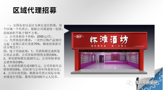 線下推廣:懷灘坊在全國各省以縣區(qū)為單位招募代理商,每個(gè)區(qū)域一個(gè)代理點(diǎn),享受區(qū)域保護(hù)。區(qū)域代理商需有實(shí)體店,店面面積不低于50平方米并根據(jù)公司規(guī)劃統(tǒng)一裝修。據(jù)代理透露,懷灘坊在全國已擁有30多家實(shí)體店。