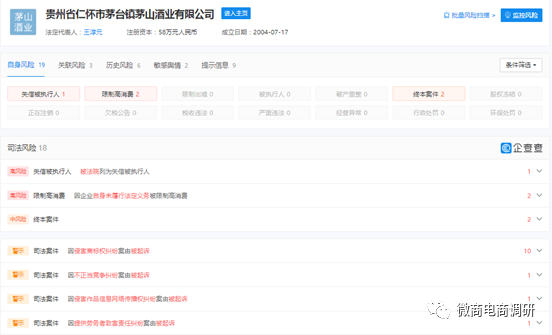 懷灘坊酒的生產(chǎn)企業(yè)貴州省仁懷市茅臺(tái)鎮(zhèn)茅山酒業(yè)有限公司成立于2004年7月17日,注冊(cè)地位于貴州省遵義市仁懷市茅臺(tái)鎮(zhèn),注冊(cè)資本為58萬元,實(shí)繳資本58萬元,法定代表人為王淳元。值得注意的是,該企業(yè)有生產(chǎn)的產(chǎn)品被抽檢不合格的記錄,還曾多次被起訴,因提供勞務(wù)者致害責(zé)任糾紛案由被起訴1次;因侵害作品信息網(wǎng)絡(luò)傳播權(quán)糾紛案由被起訴1次;因不正當(dāng)競(jìng)爭(zhēng)糾紛案由被起訴1次;因侵害商標(biāo)權(quán)糾紛案由被起訴10次,其中與貴州茅臺(tái)酒股份有限公司的侵害商標(biāo)權(quán)糾紛案和不正當(dāng)競(jìng)爭(zhēng)糾紛案值得一提。