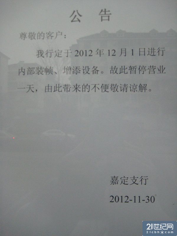 12月1日周六下午2時(shí)許,21世紀(jì)網(wǎng)趕至上海市郊嘉定區(qū)的銀行一條街,事發(fā)的華夏銀行嘉定支行大門緊鎖。門上貼有公告:“我行定于2012年12月1日進(jìn)行內(nèi)部裝禎、增添設(shè)備。故此暫停營(yíng)業(yè)一天。”