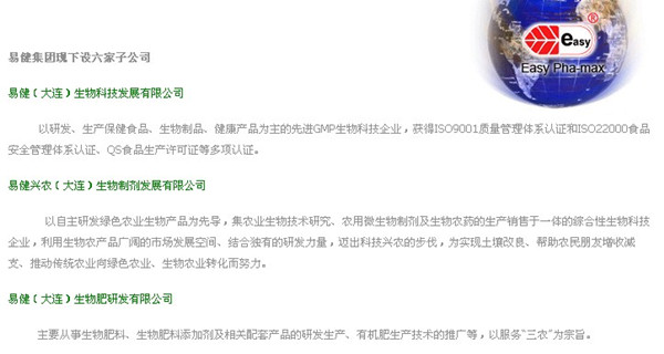 大連易健公司網(wǎng)站對外發(fā)布的公開信息顯示:"大連易健是2008年2月注冊成立的,注冊資金為1203萬美元(折合人民幣8000萬元),以研發(fā)、生產(chǎn)保健食品、生物制品、健康產(chǎn)品為主"。在易健集團介紹中詳細介紹了易健集團旗下的六家子公司,第一是易健生物科技,第二是易健興農(nóng)生物制劑有限公司,而這個易健興農(nóng)生物制劑發(fā)展有限公司就是涉嫌坑農(nóng)的那家公司。而且據(jù)知情人透露,易健生物和易健興農(nóng)的經(jīng)銷商有很多是兩家產(chǎn)品都銷售推廣,當時出面處理煙臺坑農(nóng)事件的馬姓副總就是大連易健集團常務副總裁馬郡成,坑害果農(nóng)的事情到目前為止還沒有處理結(jié)果。