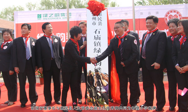 山東省青少年基金會副秘書長王太麗接受捐贈,并對綠之韻集團對社會的人文關懷表示肯定。惠民縣人大常委會副主任張秀奎與綠之韻集團胡國安董事長共同為希望小學揭牌,并向胡國安董事長頒發(fā)了惠民縣榮譽市民證書。